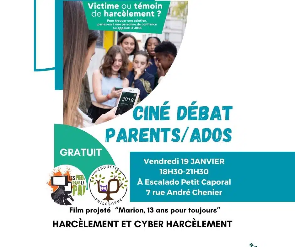 Par Escalado 8 janvier 2024 Ciné-Débat Parents/Ados Ciné-débat sur le thème du harcèlement et du Cyber harcèlement avec les Pieds dans le Paf et les chouettes philosophes. Film projeté « Marion, 13 ans pour toujours ». Inscription au siège Lire la suite